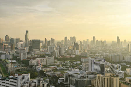 View of expanding city, changing environment. In the evening, the sun shines through cloudy sky and rain from the tower, The full-length landscape with buildings and architecture of Bangkok Thailand.