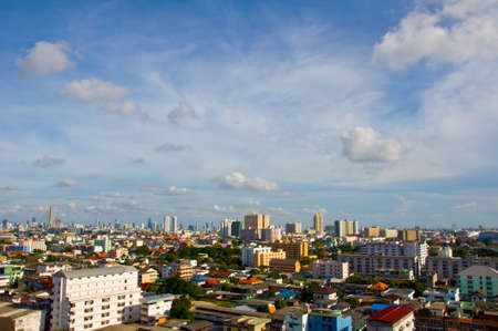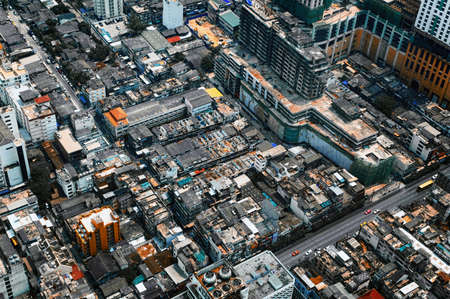 View from the high floor of the streets of Bangkok. Tall buildings and roofs of small houses. City landscape.