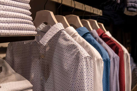 Many different colorful clothes on a hanging rack in the retail shop store. Soft selective focus photography