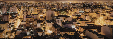 A panoramic view of a bustling city at night, showcasing illuminated buildings and streets.