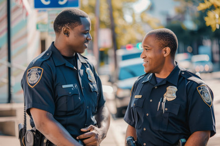 A united group of police officers standing shoulder to shoulder, ready to serve and protect, Smiling black female police officer talking to her colleagues, AI Generated