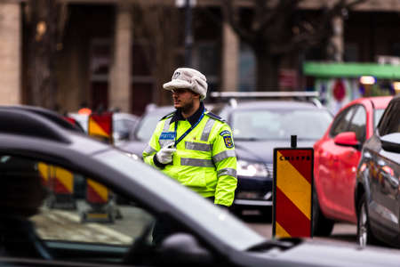 Police agent, Romanian Traffic Police (Politia Rutiera) directing traffic during rush hour in downtown Bucharest, Romania, 2021