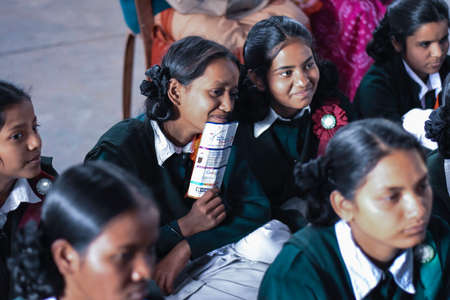 Indian students in school uniforms reading a book during lesson.
