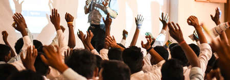 Group of people with raised hands in the classroom.