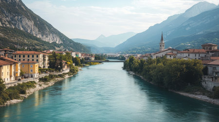 A stunning view features a serene river flowing through a picturesque town surrounded by majestic mountains, offering a perfect travel destination for nature lovers.