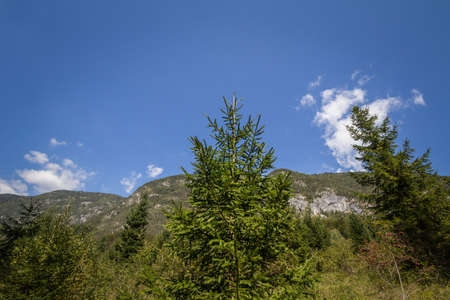 Typical Julian Alps alpine panorama in slovenia, with a focus on a young fir tree, a pine, green, in summer, with a sunny blue sky background and mountains visible.