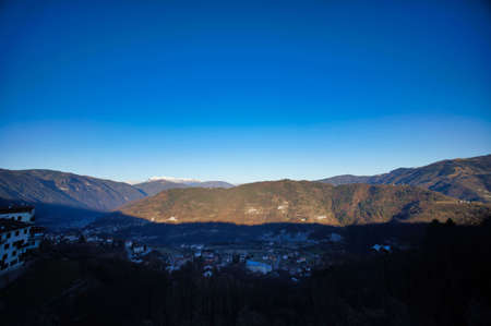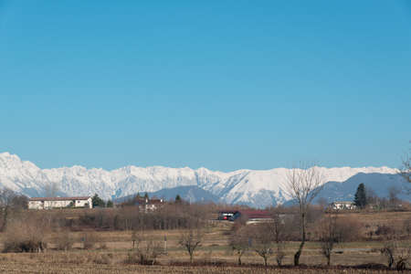 Scenic ridge of mountains in North Italy with snowy beneath them in shadow in valley in sunny spring afternoon with clear blue sky in the background
