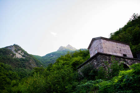 Small old temple in the middle of the mountains. Beautiful forest landscape with a temple