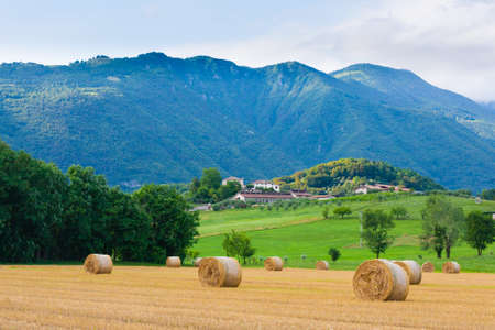 Italian countryside panorama. Round bales on wheat field. Agriculture, rural life