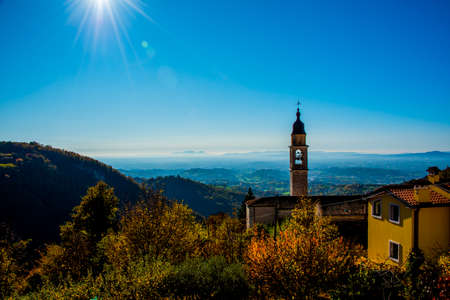 Panorama from italian hills in autumn season. Autumn landscape. Trees and hills