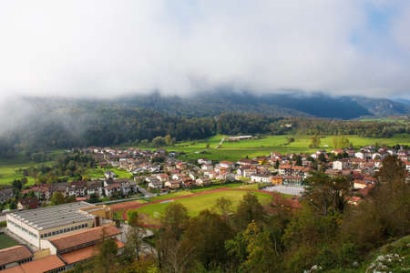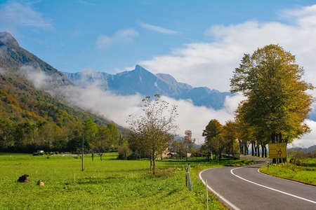 Low clouds in the autumn landscape along the road leading from the Italian border to Kobarid in the Slovene Littoral or Primorska region of western Slovenia