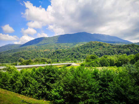 Stunning mountain landscape showcasing a vast view with lush green hills, a clear blue sky, and soft white clouds. Perfect for travel and nature enthusiasts.