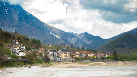 Barcis village with mountains in background and cloudy sky