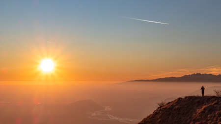 Aerial view in a gradient of orange colors in a beautiful sunset from a top of a mountain