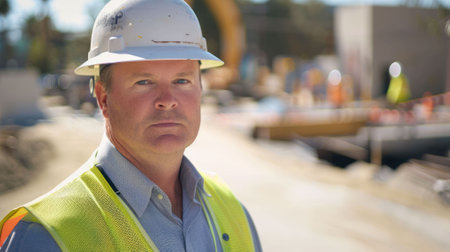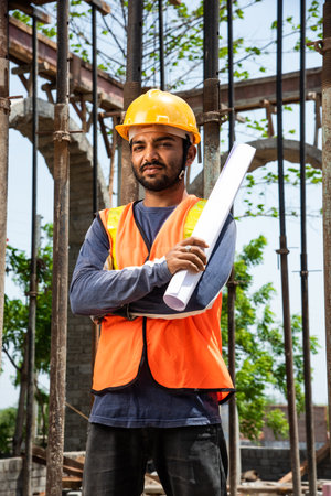 The picture of the construction worker or project manager is working on the construction site while wearing hard hat and safety jacket also require skill like safety knowledge, technical skill. AIG43.