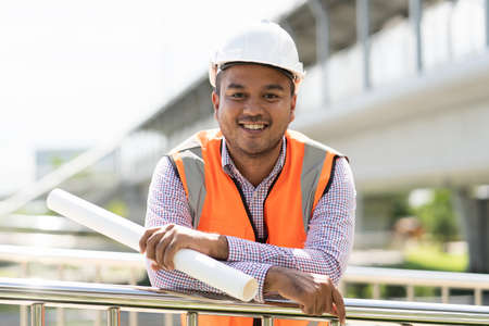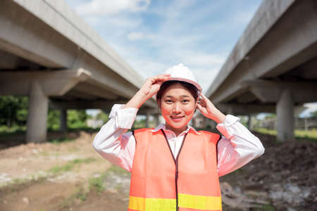 Portrait of Asian civil architect engineer inspecting and working outdoors road construction site. Supervise new road construction. Civil Engineer.