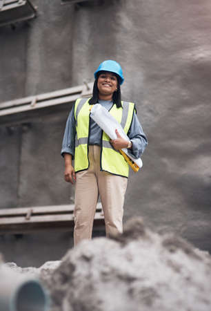 Running her site professionally. Cropped portrait of an attractive young female construction worker working on site.
