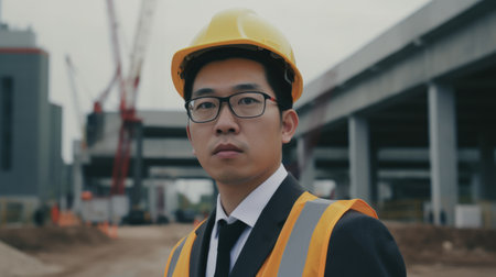 30s male asian Civil Engineer with determined face at construction site. Generative AI AIG21.