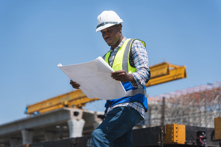 Experienced mature african descent male construction worker wearing protective gear and displaying a focused and serious facial expression while working at the construction site