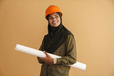 Black muslim woman in helmet smiling while posing with drawing isolated over beige background