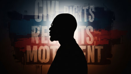 Black man profile, civil rights text background, powerful silhouette