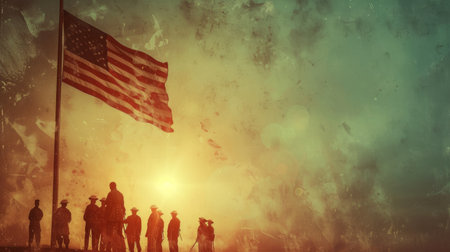 Silhouettes of American soldiers standing in a field at sunset, with the American flag waving in the wind. This image symbolizes patriotism, courage, and sacrifice.