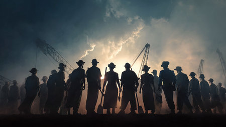 Large group of soldiers in uniform, marching across a field at sunrise. Silhouette of men in dark military attire, walking in a dense formation. Warm, golden orange sunrise lighting creates a dramatic scene, with the sun as a focal point. Soft, hazy light suggests an early morning or late evening. The soldiers are in the foreground; the background is partially obscured by a soft, hazy fog. The colors are muted and subdued, focusing on the golden orange tones of the sunrise, with dark uniforms and muted greens of the field. A feeling of historical event, military discipline, and early morning tranquility is conveyed.