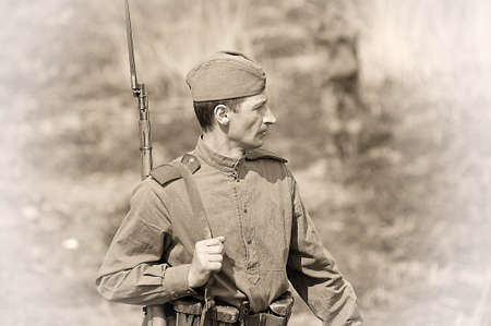 SAINT-PETERSBURG / RUSSIA - AUGUST, 22, 2020: Historical re-enactment of the battlefield of times World War II. Re-enactors dressed in uniform, military reconstruction, black and white image