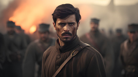 Mexican soldiers fighting French troops. background Battlefield with smoke and fire. Cinco de Mayo, Mexican defining moment. Realistic photo.