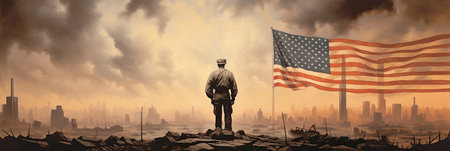 Soldier in front of the United States flag. Abstract illustration. Generative AI