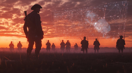 A futuristic soldier stands on a misty battlefield at sunset, engaging with Revolutionary War generals as he shares a glowing holographic map, merging past and future strategies.