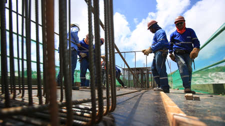 MALACCA, MALAYSIA SEPTEMBER 22, 2015: Group of construction workers fabricating steel reinforcement bar at the construction site in Malacca, Malaysia on September 22, 2015.