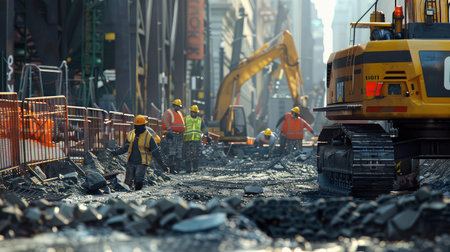 A bustling construction site featuring heavy machinery and workers engaged in various tasks amidst a dynamic urban skyline, reflecting development and progress.