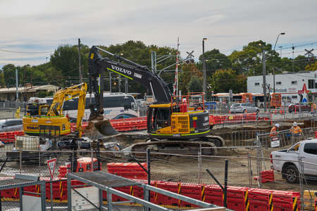 Excavators digging ground during construction of tunnel underpass underway beneath train line within city setting