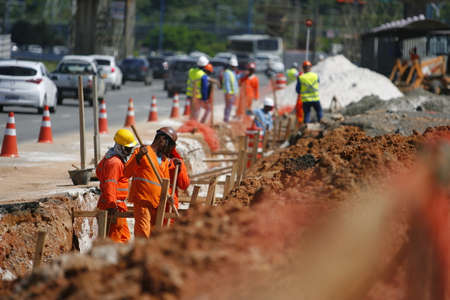 salvador, bahia / brazil - may 6, 2015: Workers work together to traffic vehicles on Avenida Antonio Carlos Magalhaes in works to expand the subway of Salvador.