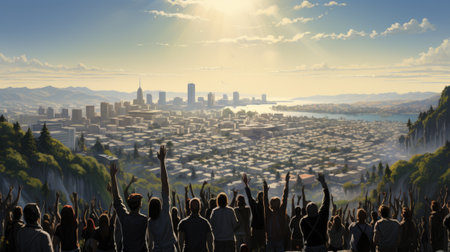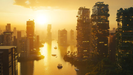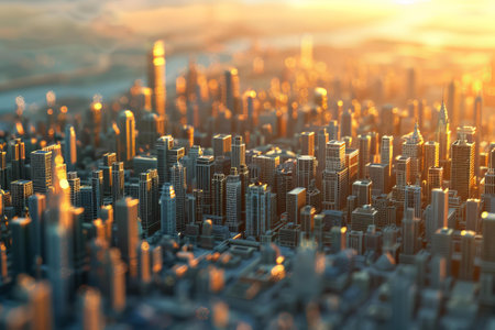 The golden hour sun casts a warm glow over a bustling city skyline, accentuating the urban expanse and atmospheric haze. Generative AI