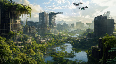 A stunning artwork illustrating the fusion of urban structures and natural scenery, capturing the delicate balance between city life and nature's beauty.