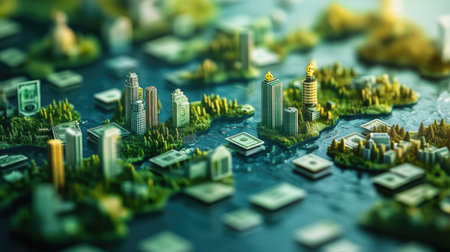 Miniature 3D island world with diverse city architecture and nature with dark background. Futuristic urban planning and green city concept. Design for urban development, eco city presentations. AIG35.