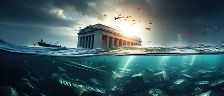 Classic building with pillars half-submerged in water, with money sinking underwater, symbolizing a financial crisis or bank failure