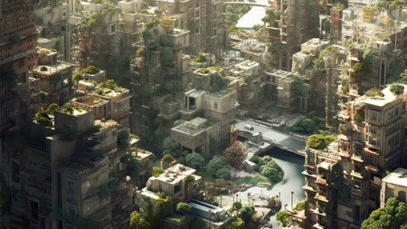 Imaginative, high-angle view of a sprawling, blocky cityscape where tall, modern structures and older buildings are heavily interspersed with and covered by vibrant green vegetation, suggesting a world where civilization has collapsed or adapted to allow nature to reclaim the urban environment, featuring visible wind turbines and solar panels integrated into the scenery.