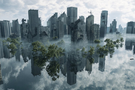 Flooded modern city with multi-storey buildings, natural flood