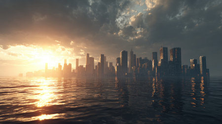 A city skyline is reflected in the water, with the sun setting in the background. Scene is serene and peaceful, as the city and water seem to be in harmony with each other
