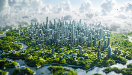 A cityscape with skyscrapers surrounded by lush trees and bodies of water, showcasing a harmonious blend of urban design and natural landscape