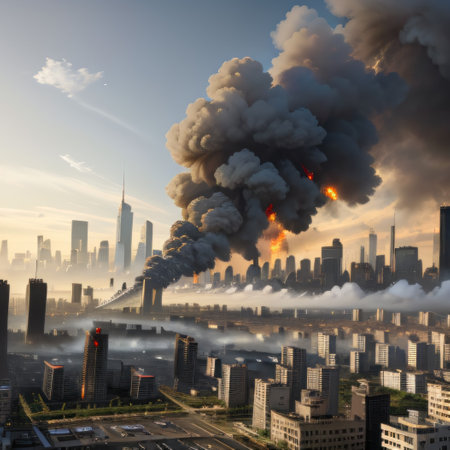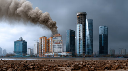 Chaotic urban environment depicting smoke emerging from a building with modern skyscrapers surrounding it, portraying issues of pollution and urban challenges.