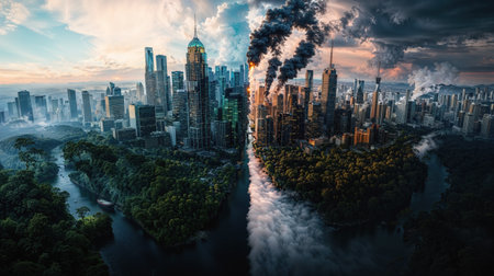 Witness two futures: a vibrant green city thriving beside a polluted dystopian landscape This hyperrealistic scenario starkly contrasts environmental devastation with urban resilience, highlighting the impact of our choices See thriving ecosystems versus desolate landscapes, a compelling visual urging action Examine the intricate details, sparking urgent conversation about our potential AI Generative