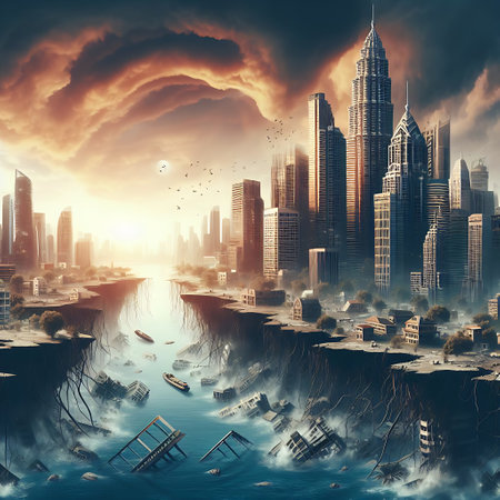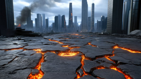 AI Generated. A dystopian portrayal of a city ravaged by disaster featuring collapsing buildings and a tumultuous sky