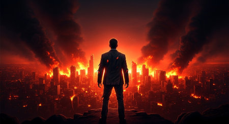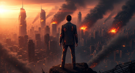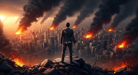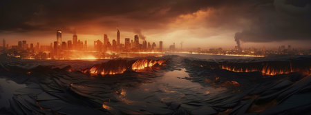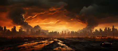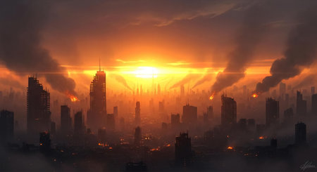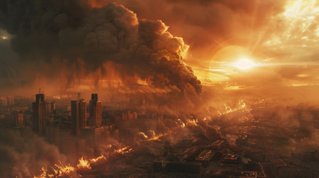 A city skyline is engulfed in massive fires and plumes of dark smoke under a dramatic, fiery sunset sky. This scene depicts widespread urban devastation and a catastrophic disaster.