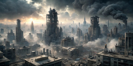 Post-apocalyptic cityscape with ruined skyscrapers and smoky atmosphere.