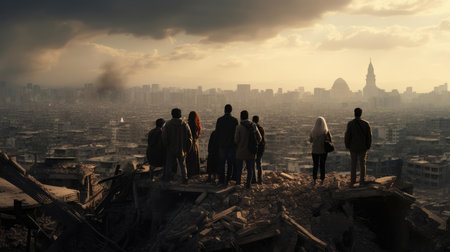 Post-apocalyptic cityscape depicting urban ruins and desolation amidst human exodus.