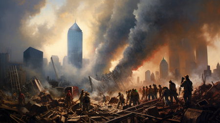 Imagining A Scenario Of Simulated Destruction, Resembling A Terrorist Attack, Monochrome Style. Сoncept Creating An Art Piece, Surreal Atmosphere, Emotional Impact, Dark And Eerie.